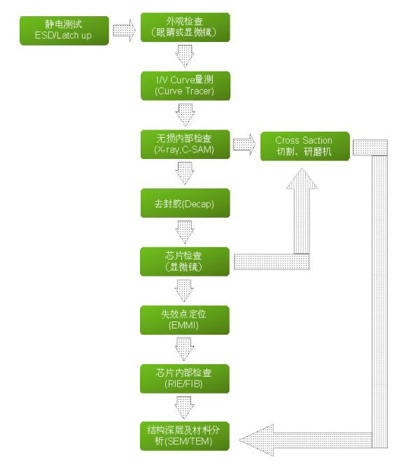 半導(dǎo)體器件的失效分析流程,國際國內(nèi)公認(rèn)的方法是從非破壞性試驗手段到破壞性試驗手段